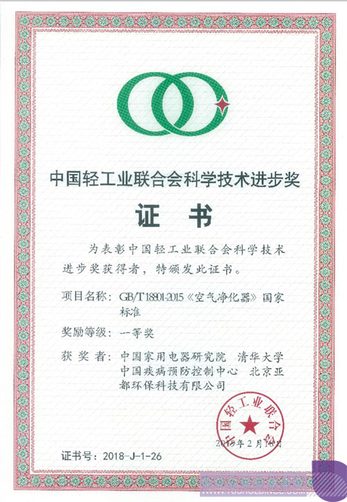 3月21日,中國輕工業(yè)聯(lián)合會四屆五次理事會在廣西南寧舉行。會議表彰了2018年度中國輕工業(yè)聯(lián)合會科學(xué)技術(shù)獎的獲獎組織和個人,由啟迪控股成員企業(yè)—亞都、中國家電研究院、清華大學(xué)、中國疾控中心聯(lián)合起草制定的“GB/T18801-2015《空氣凈化器》國家標(biāo)準(zhǔn)”項目榮獲2018年度中國輕工業(yè)聯(lián)合會科學(xué)技術(shù)進步一等獎,亞都作為該標(biāo)準(zhǔn)的主要起草單位,成為唯一獲得此項獎勵的企業(yè)單位。