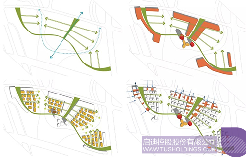 設(shè)計(jì)結(jié)合場地分析,限定周邊道路及自然景觀的的區(qū)域范圍,通過對規(guī)劃布局的軸線位置及實(shí)現(xiàn)通廊的分析,確定了展示中心的中軸布局形式。展示中心設(shè)置在中軸的端頭,形成視覺中心。核心區(qū)的規(guī)劃布局猶如一只飛舞的鳳凰,翱翔在神州大地;啟動區(qū)的形態(tài)正如那鳳凰的羽翼,寓意發(fā)揮啟迪控股的資源優(yōu)勢。展示館則像鳳頭一樣通過建設(shè)宜產(chǎn)宜居的園區(qū)環(huán)境,吸引優(yōu)秀的企業(yè)投資入住,帶領(lǐng)整個(gè)區(qū)域的產(chǎn)業(yè)創(chuàng)新與升級。核心區(qū)的規(guī)劃布局猶如一只飛舞的鳳凰。