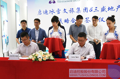 啟迪冰雪文旅集團執(zhí)行總裁侯東亮和三盛地產(chǎn)集團總裁馮勁義簽署了戰(zhàn)略合作協(xié)議。
