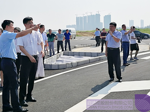 趙東副總裁(左一)向陳邂馨書記(左二)介紹基地情況