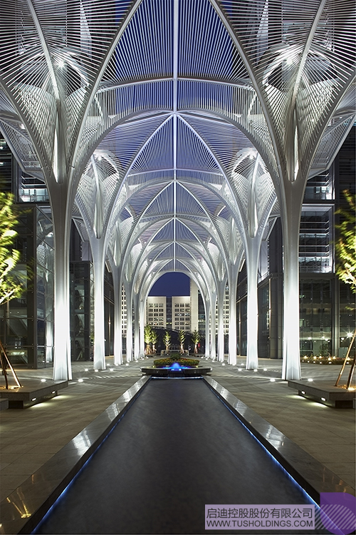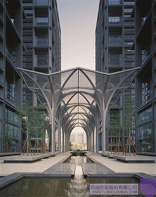分列的四塔間隙為城市道路通向園區(qū)中心綠地打開了一條綠色通廊,中心是12顆參天鋼樹,形成灰空間的限定,與二層平臺(tái)自然的樹木共同營(yíng)造出積極的公共交往空間。“樹影婆娑”下是綠意盎然的休閑廣場(chǎng),展現(xiàn)人與自然共生共融的景象。建筑首層斜插入地下的草坪,標(biāo)準(zhǔn)層四角的綠色陽(yáng)臺(tái)和頂層白色膜傘的屋頂花園無不體現(xiàn)了人性化、生態(tài)化的現(xiàn)代商務(wù)辦公理念。